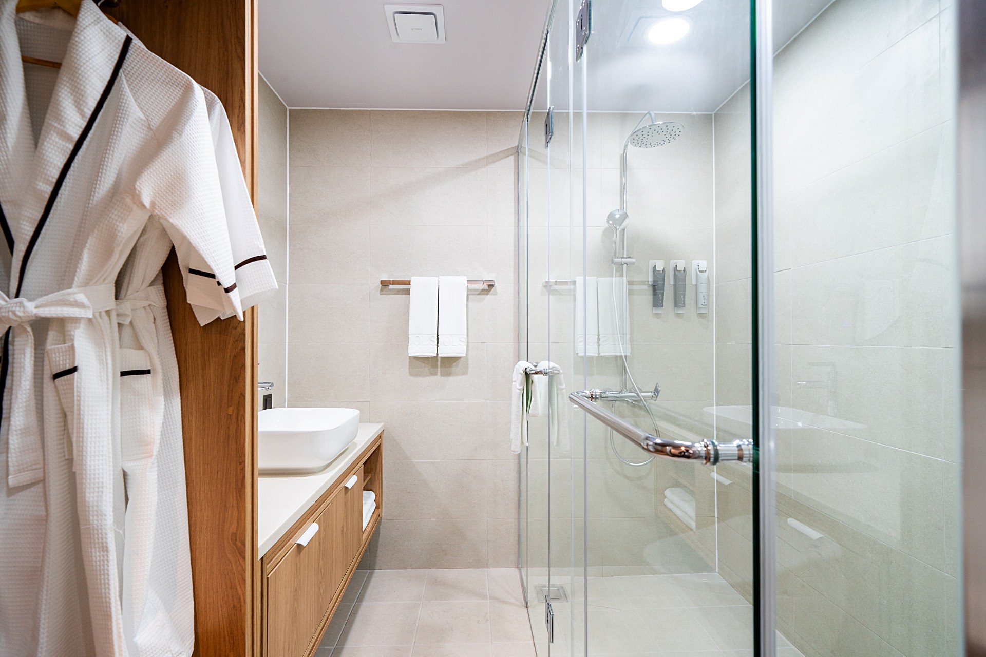 객실 : TV, 시스템 에어컨, 냉장고, 소파, 헤어드라이어, 가운, 비데, 전화기, 무소음 냉장고